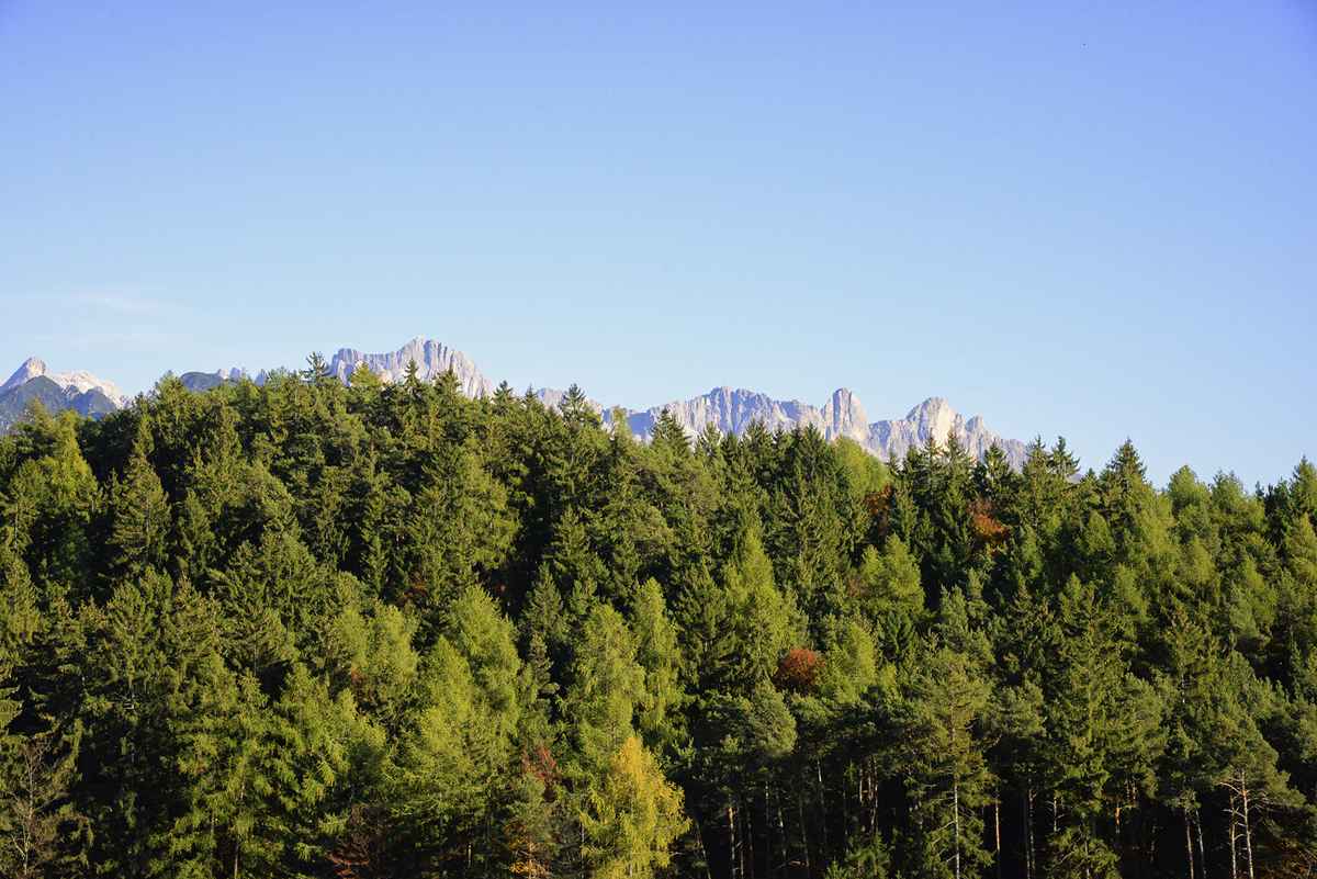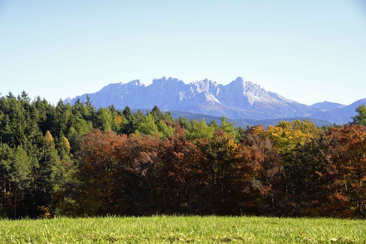 Herbstlicher Wald, im Hintergrund der Rosengarten. Südtiroler Dolomiten.