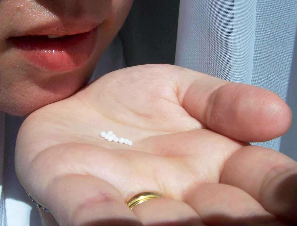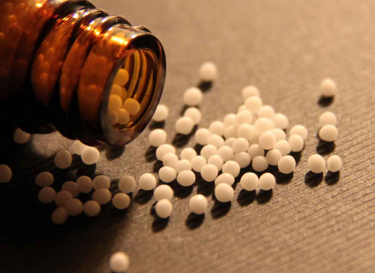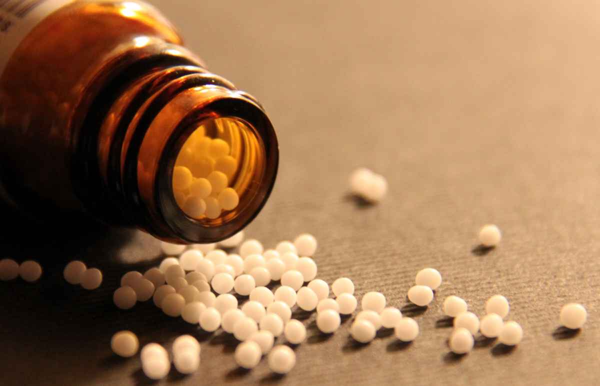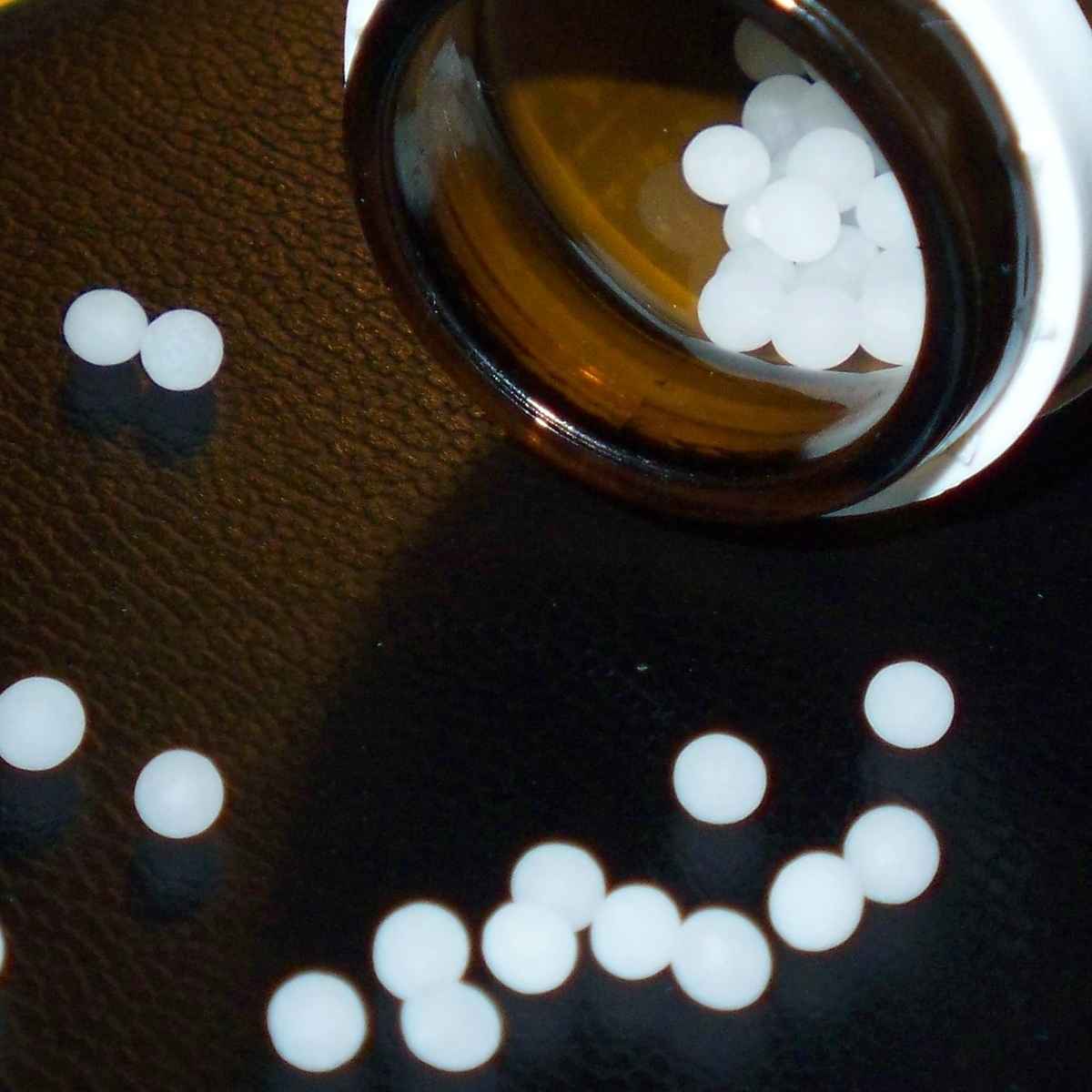 Heilkräuter (Himbeerblättertee) mit Globuli (Ovaria comp) und Fläschchen