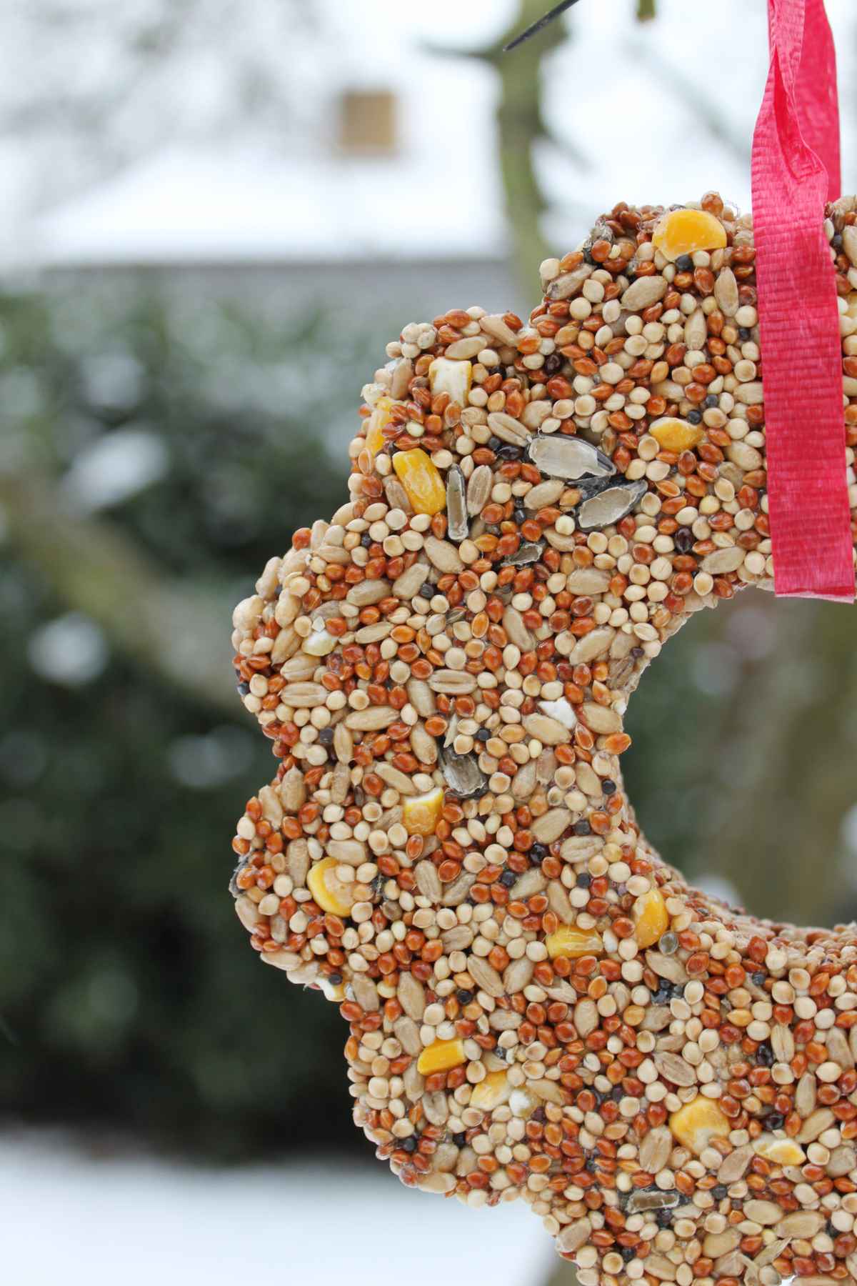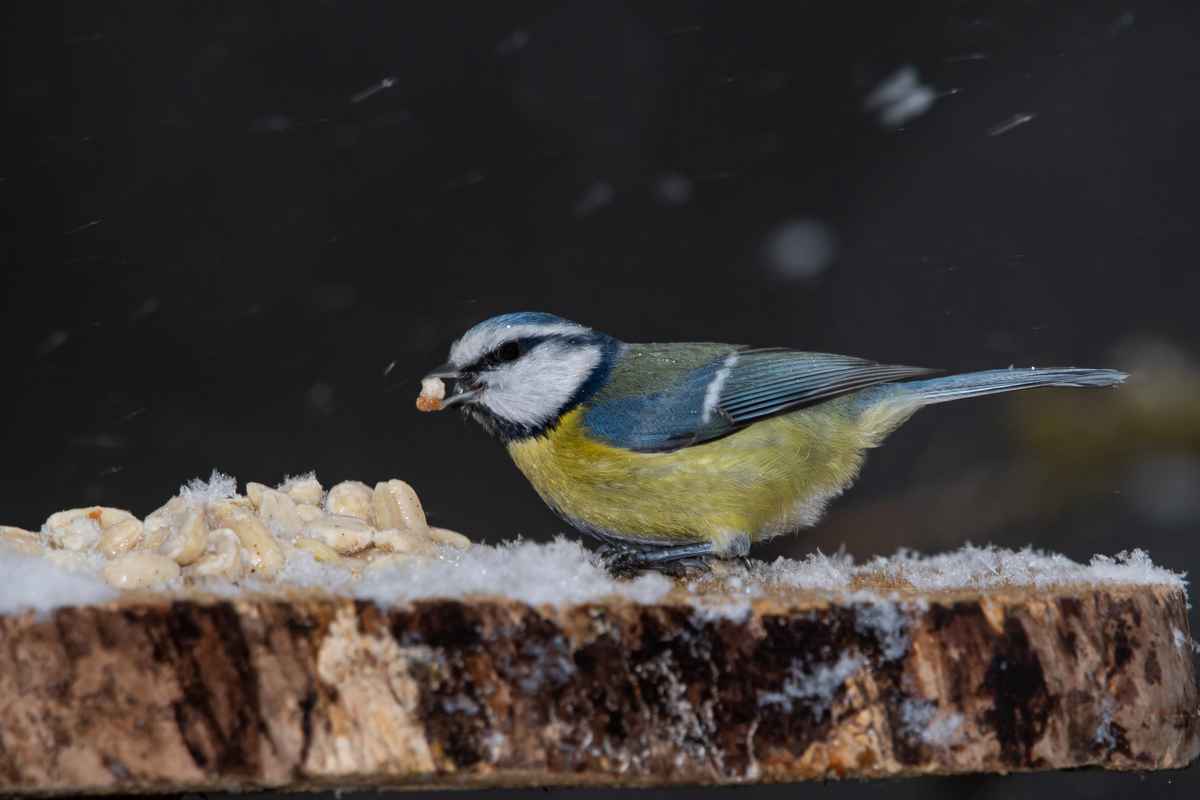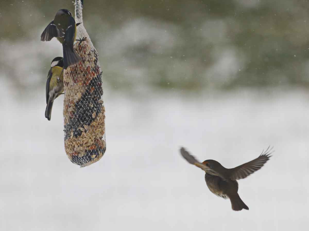 gedränge bei schneefall an der futterstelle