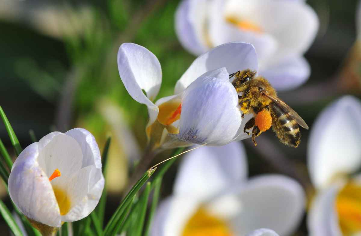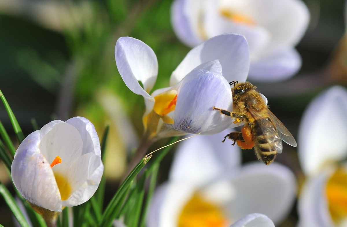Krokusse im Gegenlicht mit Biene Makro