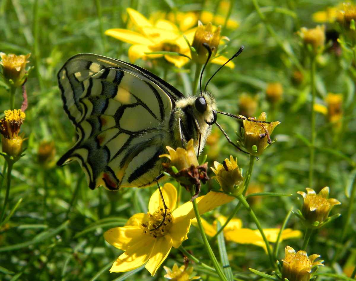 Eine entzückende Meise schaukelt am Meisenfutterball.